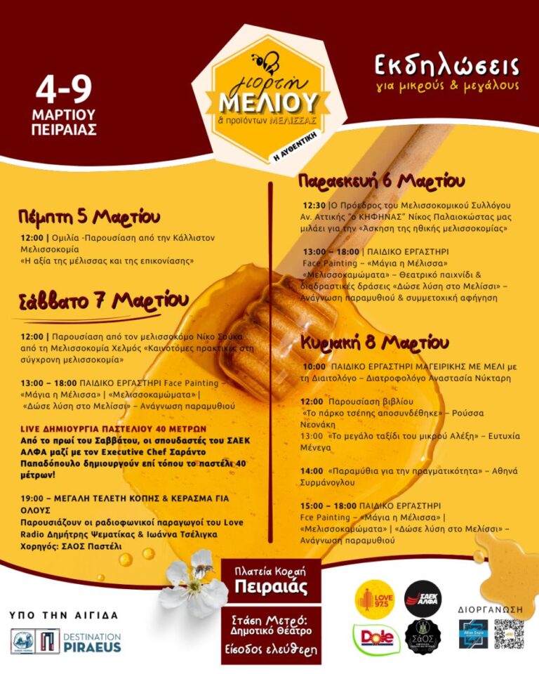 H 3melisses Andros Organic Honey θα βρίσκεται γιορτή στη γιορτή μελιού & προϊόντων ΜΕΛΙΣΣΑΣ! Σας περιμένουμε να προμηθευτείτε τα μελισσοκομικά μας προϊόντα, 4-9 Μαρτίου στον Πειραιά.